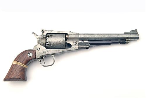 A REPRODUCTION .45 PERCUSSION REVOLVER, SIGNED STURM RUGER, MODEL OLD ARMY, STAINLESS STEEL, serial no. 145-83002 with a 7 1/2 in, sighted round barrel, adjustable rear sight (blade missing) plain cylinder and frame with smooth wooden grips, (screw missing), lossed to overall finish, with a replacement blued loading arm.