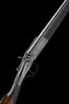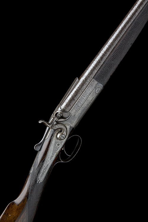 28 1/8in. black powder only damascus barrel (some pits) with elevated file-cut sighting flat, 2 1/2in. chamber, bored approx. 1/2 choke, carved percussion fence, rebounding back-action sidelock, border and partial acanthus scroll engraving, retaining very slight traces of original colour-hardening and finish, 14 3/8in. stock (small loss beneath lockplate) with steel buttplate, Deeley & Edge patent fore-end with horn finial, weight 4lb. 5oz.