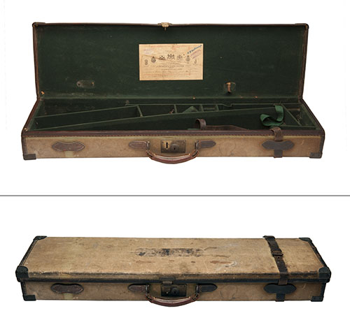 fitted for 34in. barrel, the interior lined with green baize, a paper Charles Lancaster trade label, brass lock (key missing)