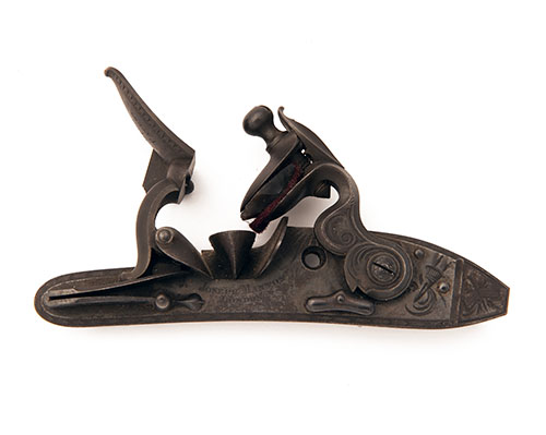 JOSEPH MANTON, LONDON AN ISOLATED LEFT-HAND COMPLETE LOCK MECHANISM FROM FLINTLOCK GUN serial no. 6769,