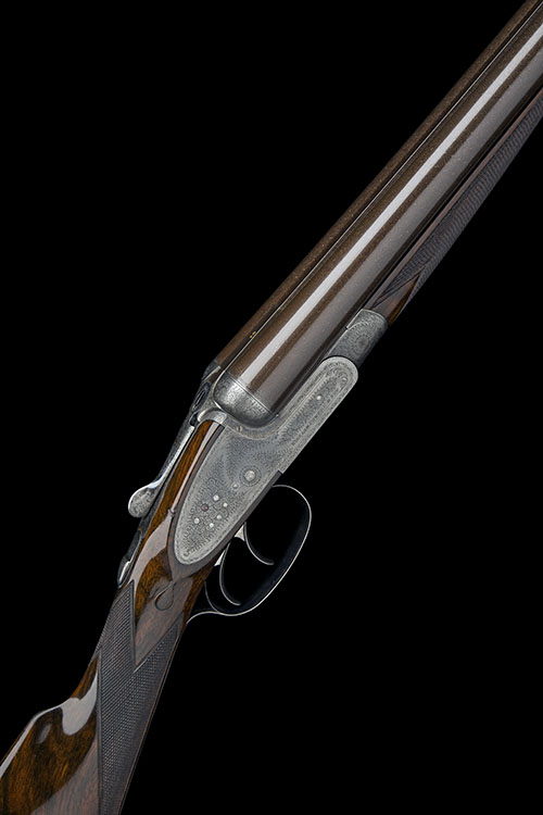 28in. nitro reproved damascus barrels, the rib engraved 'WILLIAM POWELL & SON. 35. CARR'S LANE. BIRMINGHAM.' and gold-inlaid '2', 2 1/2in. chambers, bored approx. 1/4 and 1/2 choke, treble-grip action, toplever gold-inlaid '2', automatic safety with gold-inlaid 'SAFE' detail, border and acanthus scroll engraving, retaining traces of original colour-hardening, some pins reblued, 14 3/4in. stock including 1in. extension, weight 6lb. 3oz.