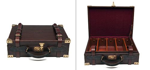 for approx. 250 cartridges, the interior lined with maroon baize. four removable dividers, five leather lifters, brass lock (key missing), the lid exterior with the monogram 'N.H.B.'