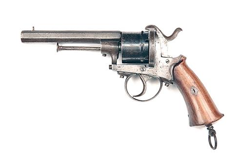 A 9mm PINFIRE SIX-SHOT DOUBLE-ACTION REVOLVER, UNSIGNED, no visible serial number, Belgian, circa 1860, with octagonal 4 1/2in. barrel, blued ratchet locking cylinder, open iron frame, smooth flared walnut grips and guarded trigger, retaining strong traces of original finish