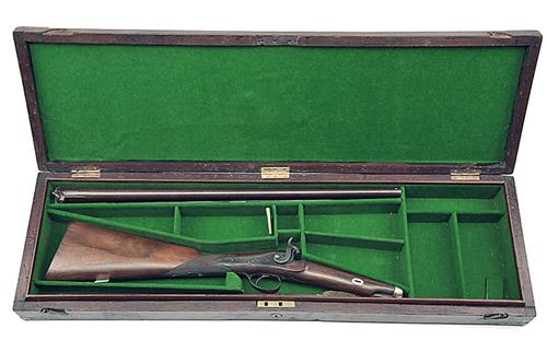 A CASED 25-BORE PERCUSSION SINGLE-BARRELLED SPORTING-GUN SIGNED 'WAKEFIELD', no visible serial number, circa 1855, with shortened 24in. barrel (pitted externally), signed scroll engraved lock walnut half-stock and brass tipped ramrod, in a period walnut storage case relined and re-fitted for this gun (small losses and repairs)