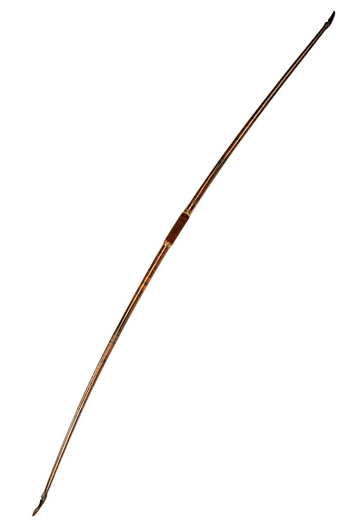 Sinhalese circa 1850, 75 1/2in. overall with shaped horn tips, the grip portion bound in red velvet (faded), the arms of the bow fully hand painted in delicate geometrics and basket-weave designs (small losses which do not detract), not recommended for use