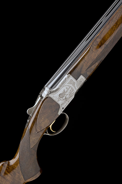 30in. nitro barrels with 17mm ventilated matt top-rib and intermediate bead sight, 2 3/4in. chambers, bored approx. 1/2 and 3/4 choke, hold-open toplever, manual safety with integral barrel selector switch, gold-washed trigger, acanthus scroll with beaded borders, surrounding game scenes of pheasant, partridge and capercaillie, signed 'R. BEE', bright finish, 14 5/8in. pistolgrip stock including 1/2in. ebonite extension and 3/4in. rubber recoil pad, weight 8lb. 1oz.