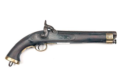 A .650 PERCUSSION SERVICE PISTOL, MODEL EAST INDIA CO. LANCER'S PATTERN, no visible serial number, circa 1860, with iron 9in. barrel, borderline engraved lock with the rampant lion trademark, walnut full-stock with heavy brass furniture, captive iron ramrod, finish worn