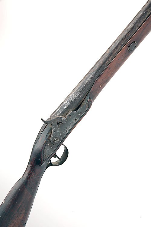 A 14-BORE PERCUSSION SINGLE-BARRELLED SPORTING-GUN, UNSIGNED, no visible serial number, circa 1800 with later conversion to percussion, round 39in. barrel, walnut half-stock, poor condition with losses