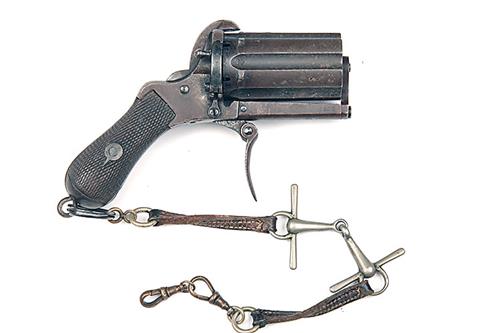 A 7mm PINFIRE 'PEPPERBOX' REVOLVER, UNSIGNED, no visible serial number, circa 1860, with fluted Birmingham proved 1 7/8in. barrel group with external locking, open iron frame, iron spurless hammer, chequered walnut bag-shaped butt with lanyard ring at heel and folding iron trigger, strong traces of finish where appropriate and fitted to a period leather and white-metal fob-chain