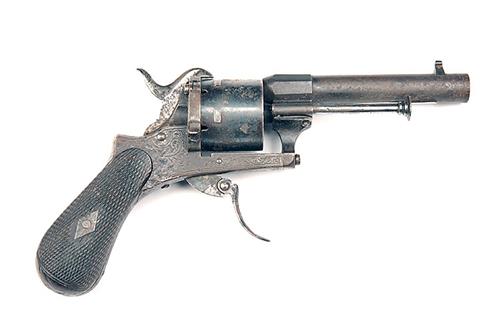 A 7mm PINFIRE REVOLVER, UNSIGNED, serial no. 7907, Belgian, circa 1860, with round 3 1/2in. sighted barrel, plain cylinder, scroll engraved open iron frame and chequered walnut bag-shaped butt, strong traces of blued finish