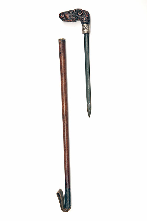A CARVED RIDING CROP WITH CONCEALED BLADE, circa 1870, with plain 21in cane body, the handle with embossed white-metal collar and 'rams-head' carving forming the grip, with a broad fullered 10in. blade