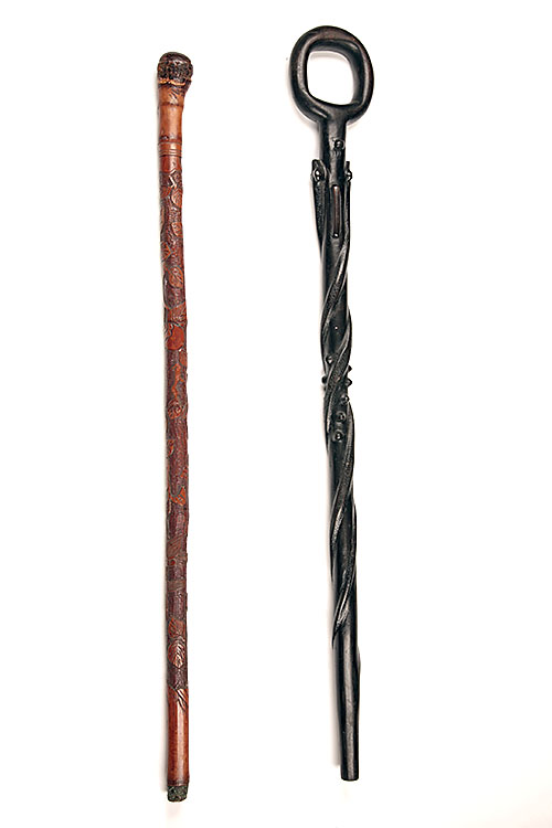 TWO VINTAGE WALKING-STICKS, the first in African black wood with carved snakes twisted around the shaft, the second Japanese and carved with foliage and birds in flight (2)