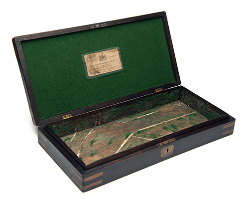 A BRASS-BOUND WALNUT CASE FOR A PAIR OF DUELLING-PISTOLS WITH WESTLEY-RICHARDS TRADE-LABEL,
