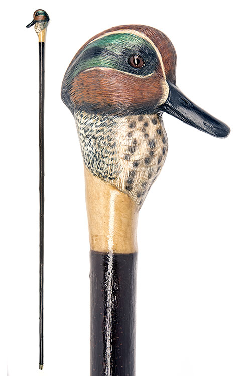 measuring approx. 59in. in length, with hardwood shaft, the head carved and painted in the form of a teal