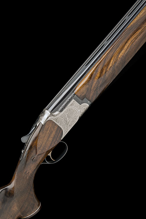27in. nitro reproved barrels with 15mm ventilated matt top-rib with intermediate bead sight, 2 3/4in. chambers, bored approx. true cyl. choke, hold-open toplever, manual safety with integral barrel selector switch, gold-washed trigger, bold acanthus scroll engraving with beaded borders, bright and blued finish, 14 1/2in. pistolgrip stock including buttplate, weight 7lb. 13oz.