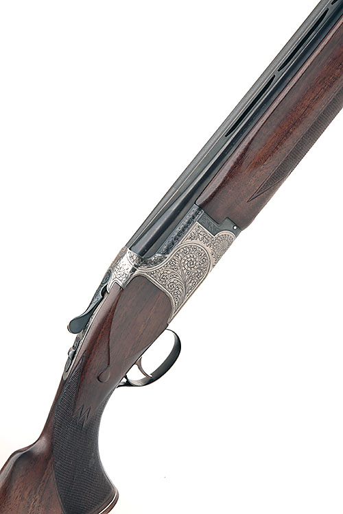 B.C. MIROKU 12-BORE 'HSW' SINGLE-TRIGGER OVER AND UNDER EJECTOR, serial no. 795008, 26in. nitro barrels, 2 3/4in. chambers, multichokes (no spares), hold-open toplever, manual safety with integral barrel selector switch, beaded border and acanthus scroll engraving, brushed finish, 14 1/4in. pistolgrip stock including buttplate (insert at head), weight 7lb. 14oz.