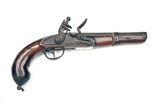 A .690 FLINTLOCK SERVICE-PISTOL, UNSIGNED, no visible serial number, Continental, probably Belgian, with iron 8in. barrel, military style lock, walnut full-stock (grip cracked through) and no provision for ramrod, iron surfaces rusted, possible other faults