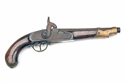 A .690 PERCUSSION COLONIAL PISTOL, UNSIGNED, no visible serial number, cut down from a Continental musket for colonial use, with Birmingham proved 10in. barrel, plain lock converted from flint, walnut full-stock with bag-shaped butt and brass furniture including French type nose-cap, missing ramrod