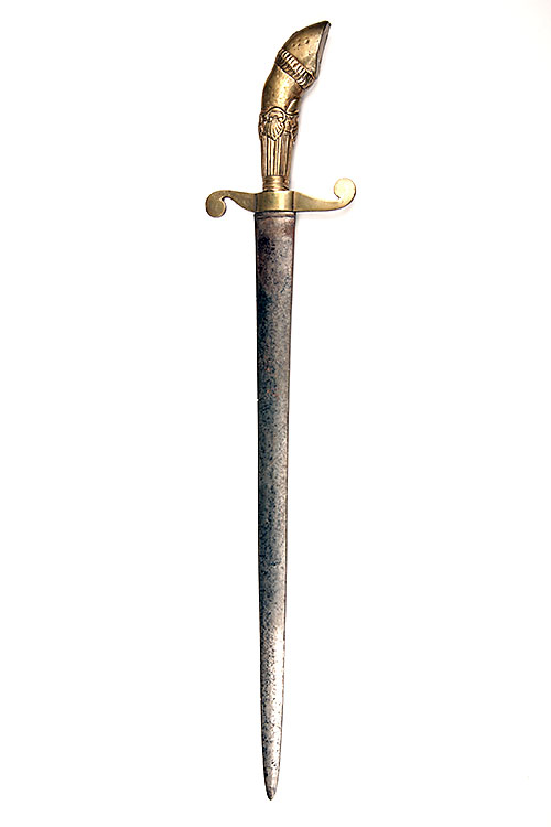 A BRASS-HILTED SIDEARM, possibly Austrian and a hunting hanger, with plain 16in. straight double edged blade, replacement brass cross-guard with rolled back and front quillions, solid brass hilt shaped as a horse's hoof, no scabbard