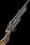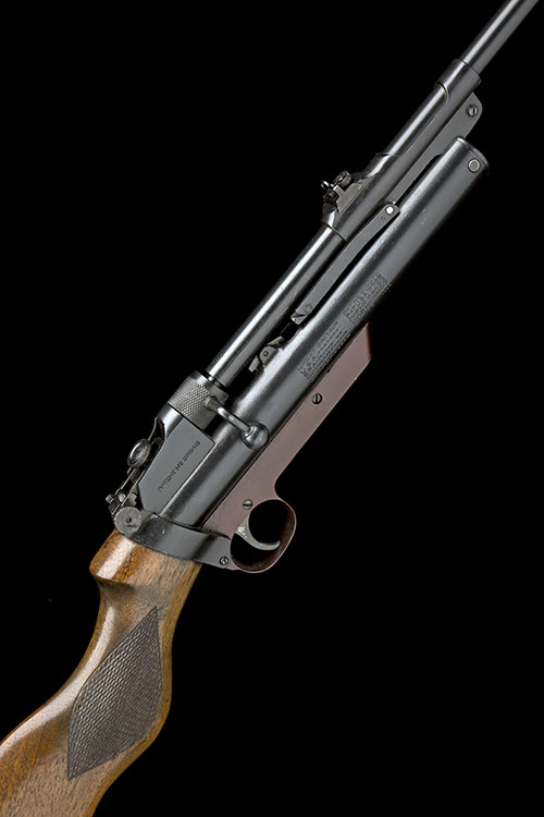 for circa 1936, with 25 1/2in. detachable barrel, ramp fore-sight with dove-tailed blade, elevating notch rear-sight, bolt handled locking device at breech, plain air-chamber with make and model-details, no provision for safety-catch on trigger-unit, peep-sight mounted forwards of wrist, walnut chequered saw-handled butt-stock and horn heel-plate, the whole refinished