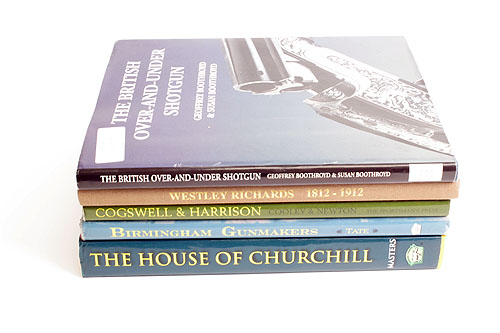 A COLLECTION OF FIVE SHOOTING RELATED BOOKS, comprising of 'THE HOUSE OF CHURCHILL' by by Don Masters, 'BIRMINGHAM GUNMAKERS' by Tate, 'COGSWELL & HARRISON' by Cooley & Newton, 'WESTLEY RICHARDS 1812-1912', ''THE BRITISH OVER AND UNDER SHOTGUN' by G. & S. Boothroyd
