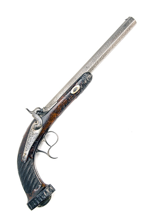 probably Belgian circa 1845, with finely etched false damascus 10 3/4in. barrel, dove-tailed bead fore-sight, standing notch rear-sight, borderlines and fern leaves engraved to breech, carved and fenced snail, borderline and scroll engraved top-tang, borderline and scroll engraved back-action lock and hammer, walnut half-stock with chevron chequered grip, chisel carved swollen pommel with engraved iron domed pommel-cap, spurred trigger-guard bow, plain trigger, white metal barrel key escutcheons and carved fore-end tip with no provision for ramrod