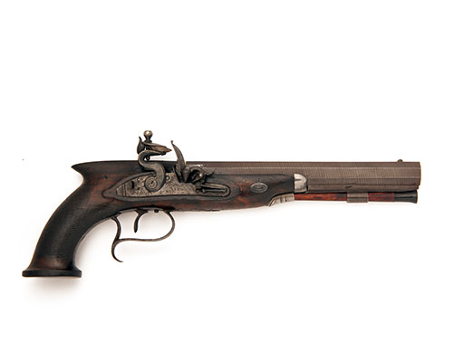circa 1810, with re-browned Birmingham proved twist octagonal 8 3/4in. smoothbore barrel, the top-flat marked in script 'LONDON' (refreshed), applied small crescent fore-sight, standing notch rear-sight to the front of the acanthus engraved top-tang, squared patent breech with gold line and platinum touch-hole, border engraved bevel-edged step-tailed lock signed in script 'ADAMS', roller borderline engraved frizzen, rain-proof pan, sliding safe behind the hammer, walnut half-stock with chequered grip, flared flat-based pommel with central escutcheon, spurred trigger-guard bow, single set trigger, white metal fore-end cap and barrel-key escutcheons, replacement horn-tipped ramrod