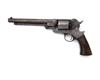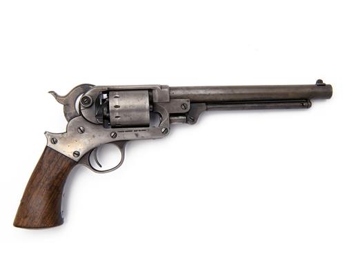 circa 1865, with round 8in. sighted barrel, plain numbered cylinder, plain hinged frame stamped 'STARR PATENT JAN 10 1856' on the right hand side and 'STARR ARMS CO NEW-YORK' on the left, smooth flared walnut one-piece grip with martial cartouche and iron under-barrel loading lever, older thin refinish