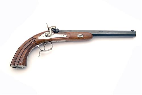 A REPRODUCTION .38 PERCUSSION PISTOL, SIGNED PEDERSOLI, MODEL MANG IN GRAZ, serial no. MG1705 with a 10in. octagonal sighted blued barrel, polished steel lock and furniture and fluted polished walnut half stock.