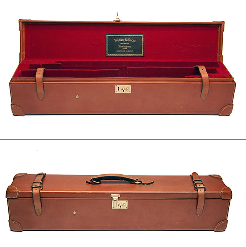 fitted for 25in. barrels (barrel section blocking detachable to revert to 30in.), with a gold-tooled Webley & Scott trade label, brass lock with keys