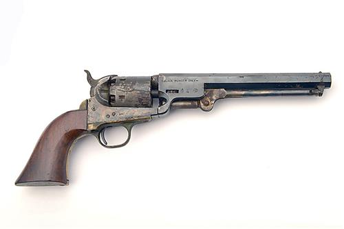 A REPRODUCTION .36 PERCUSSION REVOLVER, SIGNED UBERTI, MODEL 1851 NAVY, serial no. 82217 with an octagonal blued 7 1/2 in. barrel, a blued and roll engraved cylinder, colour hardened frame, brass trigger guard and smooth walnut grips, the whole having major losses to colour and some corrosion to most of the metal parts, action at fault.