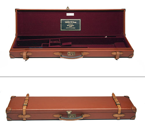 fitted for 28in. barrels (would adapt to 30in.), Webley & Scott (Incorporating W.W.Greener) gold-tooled trade label, snap-cap compartments for 20-bore size, brass lock with key