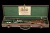 28in. nitro chopperlump barrels, the rib gold-inlaid '1' at the breech end, the tubes engraved 'CHARLES LANCASTER. 99. MOUNT STREET BERKELEY SQUARE LONDON.', 2 1/2in. chambers, bored approx. imp. cyl. and 1/2 choke, slender W. Baker patent assisted-opening action, patent no. 16778 of 22nd March 1913, with Baker patent ejectors, slender fences, removable striker discs, toplever gold-inlaid '1', automatic safety with gold-inlaid 'SAFE' detail, cocking-indicators, non-selective single trigger, fine acanthus scroll engraving with floral bouquets, the lockplates gold-inlaid 'TWELVE - TWENTY', the underside with a scrolling banner gold-inlaid 'CHARLES LANCASTER LONDON', bright finish, 15 5/8in. highly-figured stock including 1 5/8in. wooden extension, the fore-end iron with decorative scroll engraving surrounding the serial number, the finial gold-inlaid '1', weight 6lb., in a leather case