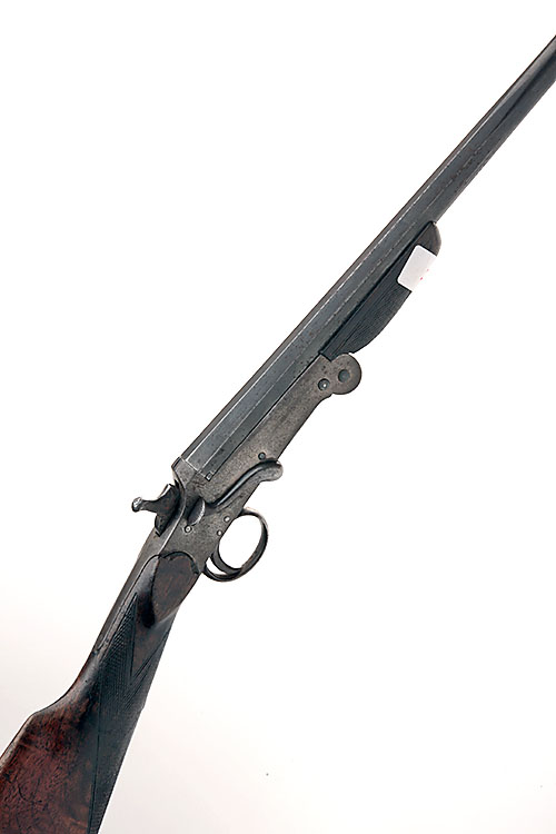 A BELGIAN .410 SINGLE-BARRELLED SIDELEVER FOLDING HAMMERGUN, serial no. 7909, 28in. nitro reproved octagonal to round barrel, 2 1/2in. chamber, bored approx. imp. cyl. choke, 14in. stock (pinned at head) with steel buttplate, weight 3lb. 8oz.