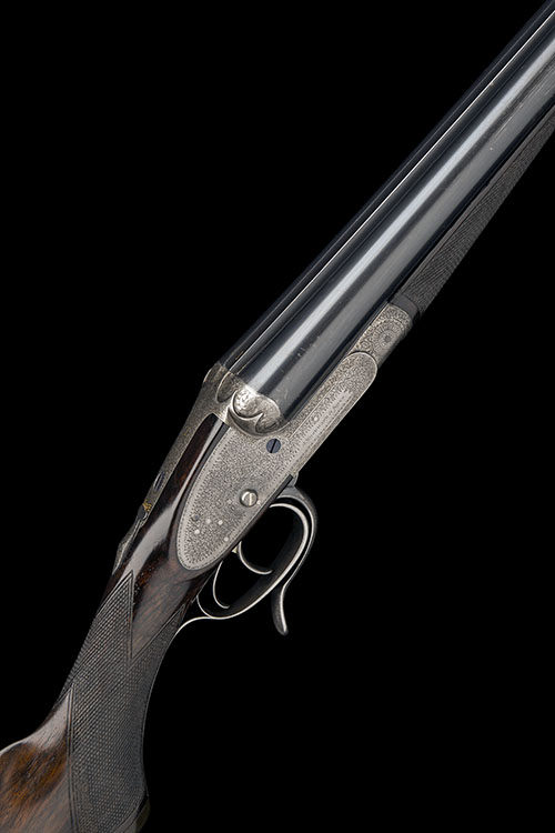 29in. nitro reproved Whitworth-steel chopperlump barrels (loose on action), the rib engraved in gothic script 'THE AUTOMATIC' and 'JAMES WOODWARD & SONS. 64 ST. JAMES'S. LONDON. MADE OF SIR JOSEPH WHITWORTH'S FLUID PRESSED STEEL', and gold-inlaid '1' at the breech end, 2 1/2in. chambers, bored approx. imp. cyl. and 1/4 choke, push-forward underlever (stiff), T. Southgate and J. Woodward patent 'Automatic' lever-cocking action, patent no. 600 of 1876, use number 604, incorporating T. Perkes patent ejectors, patent no. 12176 of 8th September 1887, use number 418, removable striker discs, side-clipped arcaded fences, the top-strap gold-inlaid '1', automatic safety with gold-inlaid 'SAFE' detail, protruding tumbler pivots with gold-inlaid cocking-indicators, best fine border and floral scroll engraving, brushed finish, 14 3/8in. highly-figured stock with Prince of Wales semi-pistolgrip with pistolgrip-cap and including horn buttplate, weight 6lb. 6oz.