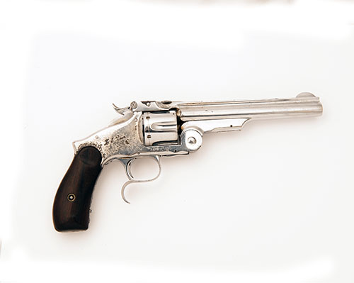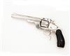 circa 1877, with nickel-plated 6 1/2in. barrel, the top-rib marked with patent dates to 1875 and terminating in 'REISSUE 1871', integral crescent fore-sight, fixed rear-sight notch to the barrel latch, automatic ejecting fluted cylinder, break-open frame, the right hand side inscribed 'L.E. BAIN', smooth walnut grips, provision for lanyard loop at heel (original broken off and absent), spurred trigger guard, the whole retaining a good amount of original nickel-plated finish