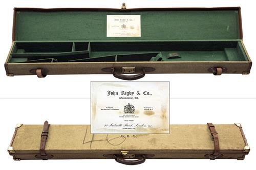 interior length 46 3/4in., the interior lined with green baize, a John Rigby & Co. trade label, brass lock (including key), the lid lid exterior with 'G.B.G.'