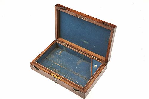 AN ENGLISH MARKET OAK STORAGE CASE FOR A REVOLVER, circa 1880, external dimensions 11in. x 7 1/4in. x 2 3/8in., the interior mostly stripped of compartments but retaining the original blue baize interior lining, external flush fitting hook closure with central lock (no key) and circular brass milled edge escutcheon to lid