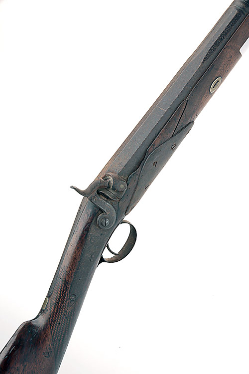 A 10-BORE PERCUSSION SINGLE-BARRELLED SPORTING-GUN, UNSIGNED, no visible serial number, circa 1860, with triple staged 34in. barrel, back-action lock, walnut half-stock (broken through behind lock with plated repair) and period ramrod (distressed, rib loose)