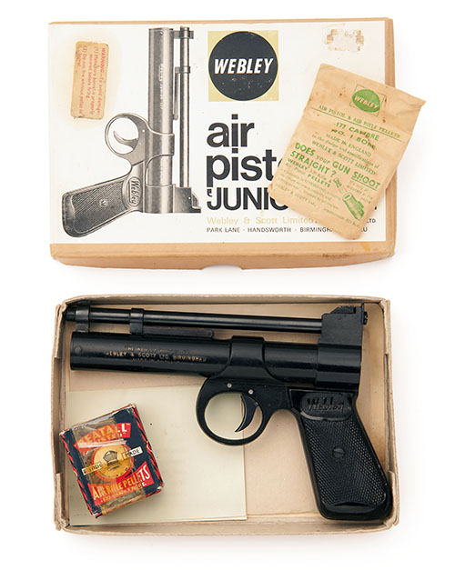 circa 1972, with 6in. smoothbore barrel, adjustable rear-sight, enamelled air-chamber and frame marked 'THE WEBLEY JUNIOR .177, WEBLEY & SCOTT LTD. BIRMINGHAM, MADE IN ENGLAND', black chequered plastic grips, appearing practically unused in its makers buff card carton with instructions inside the lid, spares sheet, sample pellets and warning labels