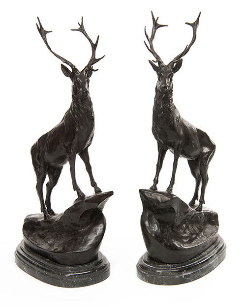 A PAIR OF BRONZE STAGS SIGNED BY T. MAIGNIERY,