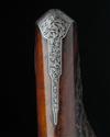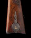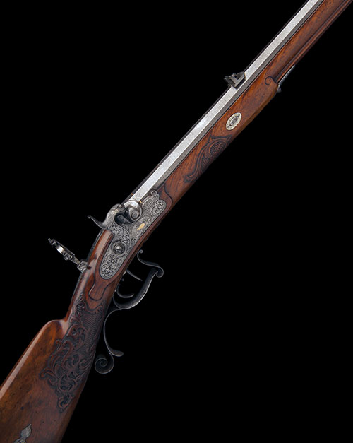 circa 1840, with fine damascus octagonal 28 3/4in. barrel, the top-flat signed in gold 'A.W. EDLI IN LEIPZIG' within a silver gilt border (small losses to inlay), dovetailed fore-sight, dove-tailed rear-sight with elevating blade, gold line at breech, carved scrolled snail, border and scroll engraved breech-block and top-tang, the latter featuring a bordered panel of a standing stag in gilt, the rear of tang fitted with a moulded square socket containing an aperture sight adjustable via two key-ways (key included), borderline and scroll engraved bar action lock and carved dogs-head hammer, the former with a bordered panel on the bar containing a gilded recumbant deer, walnut full-stock with basket-weave chequered panels surrounded by carved acanthus scrolls, carved cheek-piece with a further panel of acanthus carving on a stippled ground behind, iron hinged patchbox engraved with scrollwork around a gilded depiction of a hunter with a killed stag, moulded and engraved iron heel-plate and complex trigger-guard with raised lower tang, the bow with a gilded engraving of a mountain goat, double set-triggers, engraved iron ramrod throat with plain thimbles, carved ramrod channel, three barrel keys with engraved oval escutcheons, moulded bone fore-end tip and iron mounted mahogany ramrod