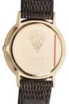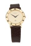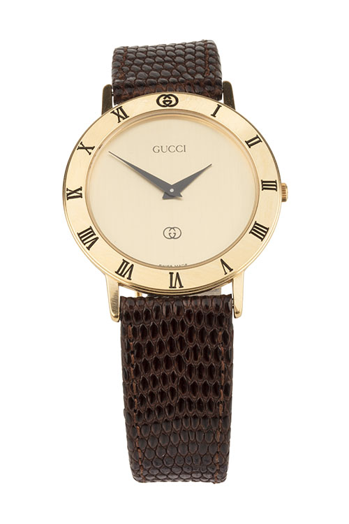 circa 1990, 6 jewel quartz movement with brushed gold coloured dial signed at '12', black sword hour and minute hands, Gucci trademark at '6', polished plated bezel engraved with roman numerals for the hours, the '12' substituted for the Gucci trademark, plated circular case with snap-on back, setting button in the band at '3', plain lugs and fitted with a Gucci branded lizardskin strap with gilt Gucci buckle, in its manufacturer's leatherette box, the whole appearing little used