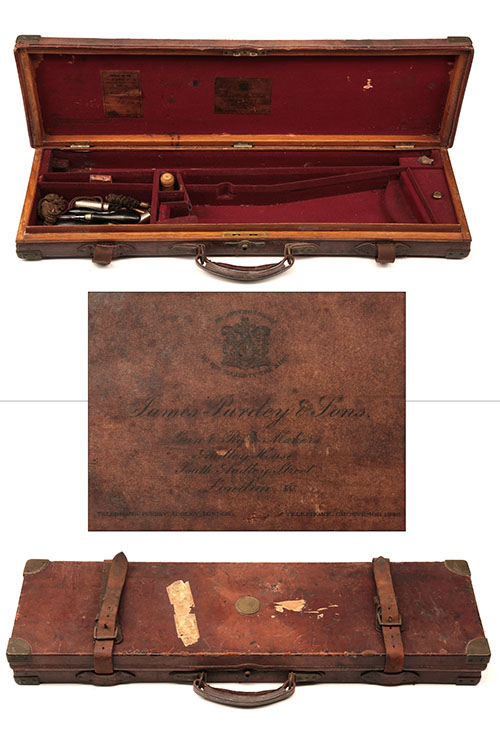 fitted for 30in. barrels, the interior lined with red baize, a James Purdey & Sons trade label, a Charges for Guns label fo serial no. 21905, including striker key, turn screws, central brass push-button lock (including key), the lid exterior with a blank brass escutcheon