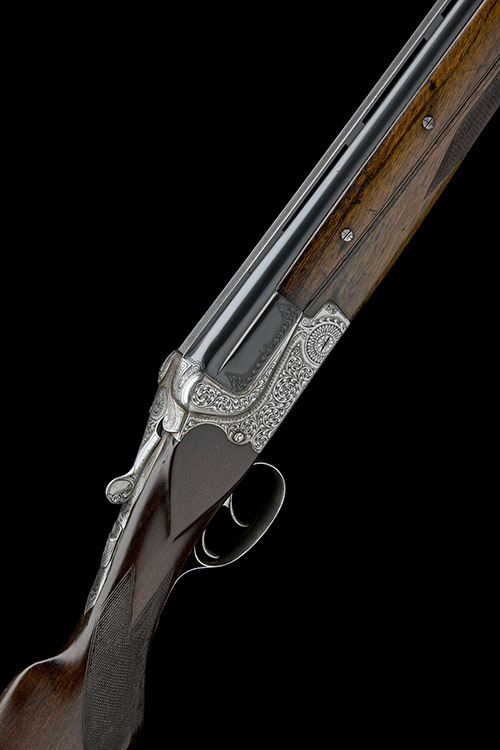30in. nitro reproved barrels with 8mm ventilated matt rib, 2 3/4in. chambers, bored approx. 3/4 and full choke, scroll-backed action with side-bolsters, hold-open toplever, manual safety, articulated front trigger, bold acanthus scroll engraving on a matt background, 15in. semi-pistolgrip stock including 15/16in. rubber recoil pad, (cast on for the left shoulder), weight 7lb. 6oz.