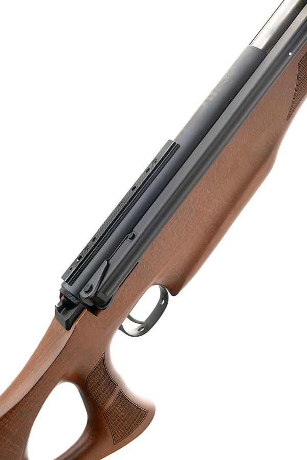 A BOXED .22 SIDE-LEVER SEMI-RECOILLESS AIR-RIFLE SIGNED DIANA, MODEL '56', serial no. 20075830, with 17 1/4in. barrel including built-on sound-moderator, sliding breech, blued air-chamber with applied telescopic sight rail, rear-mounted safe and chequered beech three-quarter stock, appearing unused in its makers card carton