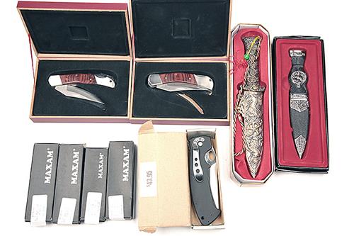 A GROUP OF NINE NEW AND UNUSED KNIVES IN THEIR MAKERS CARTONS, including five lock knives signed 'MAXAM', two lock knives, the boxes marked 'CORFU', a 'CELTIC WORKSHOP' skein dubh and an unsigned fantasy style dagger (9)