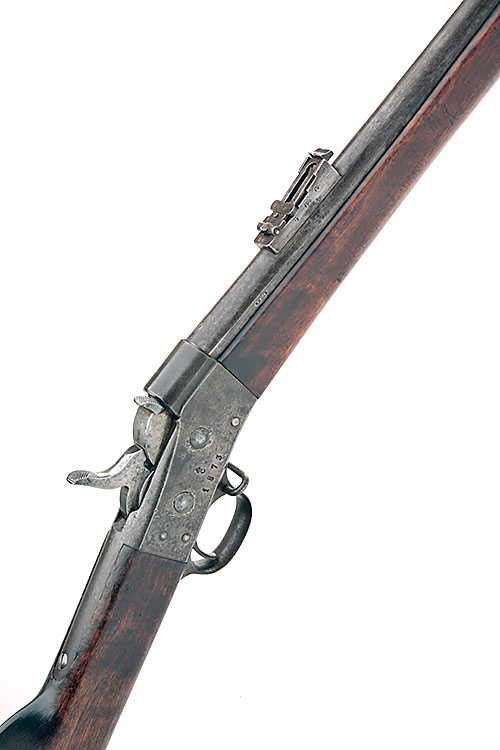 A 12.7mm x48R (SWEDISH) SINGLE-SHOT SERVICE RIFLE MODEL REMINGTON ROLLING BLOCK SWEDISH CONTRACT, serial no. 18675, dated for 1873, with 37 1/4in. sighted barrel, slab-sided receiver with central rolling breech and hammer and walnut butt-stock with three-quarter fore-end, missing clearing rod
