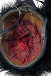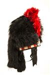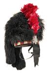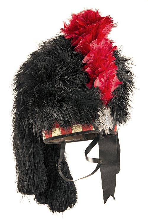 circa World War Two, with black ostrich feather shell, four tails, red feather plume, the white metal badge mounted to a black silk rosette, in turn on a red, white and black chequered band, leather internal sweat-band and later plastic chinstrap (repaired)
