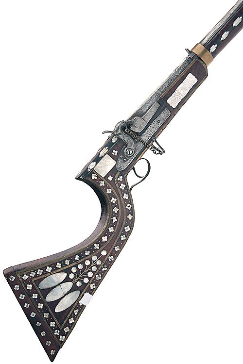 A 34-BORE PERCUSSION INDO-PAKISTANI MUSKET, UNSIGNED, no visible serial number, assembled from earlier parts and re-stocked for the tourist market, with carved and moulded 33in. barrel circa 1800, square heavy breech, engraved bar-action lock and sind-style full-stock heavily decorated with brass and mother of pearl
